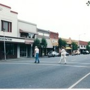 Photo--color: Main Street Sebastopol businesses on east side of street in 1998. From L-R: The IOOF Building and Bicycle Factory, Sprint, Healing Loft, Old Main Street Saloon, Pine Grove Consignments (clothing) , Main Street Traditions(gifts and décor) , Devlin Jewelry Design, Milk and Honey, Tombe Realty, Main Street Computers, Worldly Goods, West America Bank.