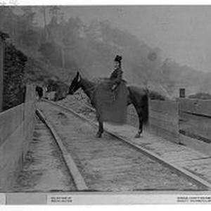 Photo--black and white: Mrs. Vanderleith on horseback on ramp at Charles E. Fuller's Mill, Occidental 1898