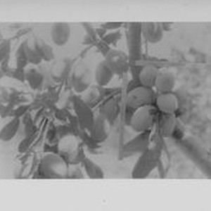 Photo--black and white, matted: Plum branches with rulers vertical and horizontal in branch.