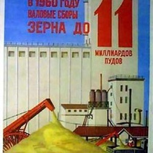 Soviet poster. Text reads, "Доведём в 1960 году валовые сборы зерна до 11 миллиардов пудов / Dovedem v 1960 godu valovyi sbor zerna do 11 milliardov pudov", meaning, "In 1960, we should produce 11 billion poods (1 pood = 16 kilograms) of grains". [Description English/roman)]