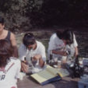 Biology 51 students look through microscopes near Bernard Field Station lake.