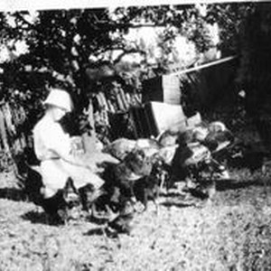 Mrs. F. J. (Eloise) Riddell on the ranch feeding chickens and turkeys. Circa 1930