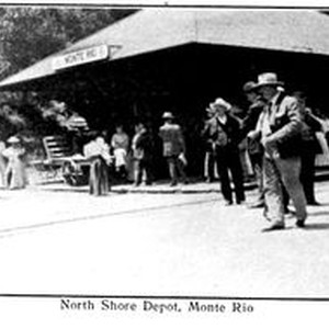 Print--black and white: Postcard booklet photos of Monte Rio on the Russian River, California circa 1900s. Caption: North Shore Depot, Monte Rio.