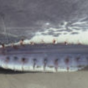 A close-up of a whale's upper jaw from below the tooth sockets.