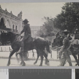 US servicemen on horseback and walking, move through the Plaza de Armas near the Municipal Palace in Veracruz, Mexico. Title and date transcribed from envelope.