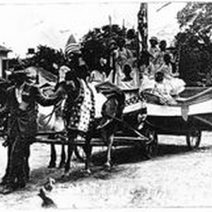 Photo--black and white: Sebastopol Fourth of July celebration, 1909. A man in leading a wagon pulled by two horses decorated in stars and stripes bunting. The wagon carries girls in white dresses.