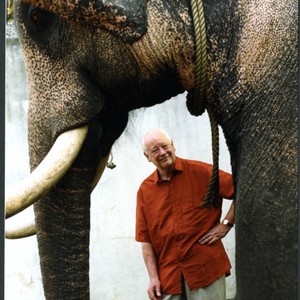 Color photo of Charles Handy outside in back of an elephant, taken by Elizabeth Handy. Charles is outside and standing in back of the elephant, near its mouth. He appears with his hand on his hip.