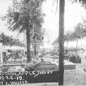 Postcard, black and white: A 1912 Gravenstein Apple Show exhibit of the sinking Titanic and an iceberg made of whole and dried sliced apples in a square pool of water. On the iceberg is the name W. S. Liddle who was an Englishman that bicycled around the world and settled in Sebastopol.