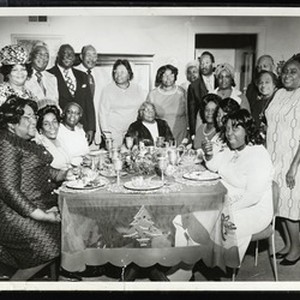 Photograph of an unidentified group of people around the kitchen table (Christmas table cloth), Texas, [s.d.]. "Dewitt Humphrey Studio, commercial and portrait, res. phone HA8-2190 bus. phone: HA8-5191, 4321 Oakland Ave, Dallas, Texas" -- stamped on back. [Description English/roman)]