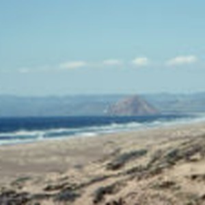 Panoramic view of the coastline at Morro Bay with sand dunes in the foreground, and Morro Rock in the background.