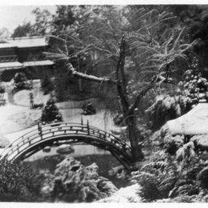Tiny snapshot of the Japanese garden covered in snow. The grounds of the San Marino ranch after a rare southern California snowfall. MS note on verso reads "Jan. 15, 1932." MS notes on envelope say "Snow pictures at Huntington Library Jan. 15. 1932" and "from: Maurice Block estate, 1966."
