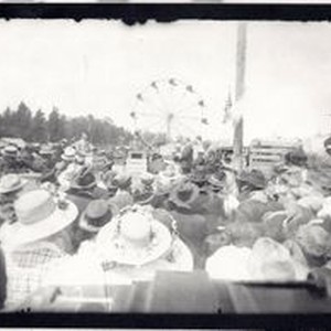 Photo--black and white from glass negative: A large crowd with their backs to the camera listening to two men who appear to be speaking to the crowd. A Ferris Wheel in the background. To the right several cows are standing. Possibly a county fair or Gravenstein Apple Fair.