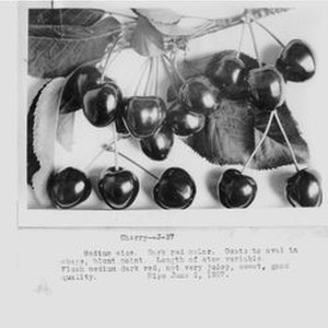 Photo--black and white: Identification of Luther Burbank cherry hybrid from the Gold Ridge Experiment Farm. Single cherries and leaves. Information attached: "Cherry J-27 Ripe June 2, 1927." John Ross Photographer