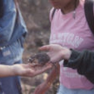 Jane Jackson, Mart Pearson, Weezie Merrit, Dana Seltzer, and Rob Ellis holding and observing a small rodent.