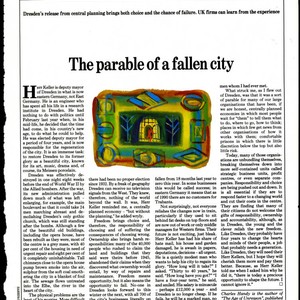 Charles Handy article on how the removal of central plannig from Dresden creates the opportunity for both freedom of choice and failure, and how UK organizations can learn from Dresden's situation, 1991; Charles Handy Papers; Box 20, Folder 4; 1 page