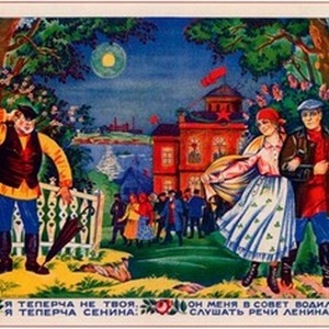A poster dedicated to the political education of the Soviet women. The caption reads "Ia tepercha ne tvoia, ia tepercha Senina: on v Sovet menia vodil slushat' rechi Lenina", meaning, "I'm not yours anymore, now, I'm Senya's: he took me to the local Soviet to listen to a Lenin's speech". [Description English/roman)]