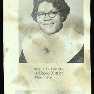 Photograph of Mrs. T.D. Daniels, Hillsboro district missionary, [s.d.]. [Description English/roman)]