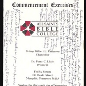 All Saints Bible College commencement exercises program, Memphis, Tennessee, 2005 November 13. Handwritten notes are on the program. [Description English/roman)]