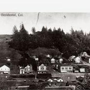 Photo -two, black and white (one photo is cropped version of postcard photo). Enlargement of postcard by Richard Behrendt of San Francisco for W.B. Coy General Merchandise, Occidental, California. The Coy store in the building to the center left behind the three railroad cars with one cupola. The Altamont Hotel is to the right next to Third Street with two cupolas. The steeple of Occidental Methodist Episcopal Church is located at far right. Printed after January 1907. Railroads: "North Pacific Coast reached town (Occidental) late summer 1876. Sold Jan, 1902 became North Shore until 1/8/1907 it became Northwestern Pacific RR Co. Handwritten information on back.