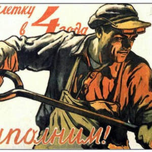 Soviet poster. Caption reads, "5-летку в 4 года - выполним! / 5-letku v 4 goda - vypolnim!", meaning, "Let's complete the Five-Year-Plan in 4 years!". [Description English/roman)]