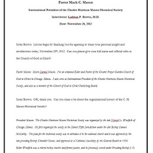 Transcript of interview of Mack C. Mason by Ladrian P. Brown, 28 Nov. 2012. [Description English/roman)]