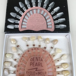 Scope/Content: Denta Pearl Cyclo-Mold plastic teeth color shade guide, produced by H.D. Justi & Son Inc. Philadelphia; includes product information insert and original box; dental, dentures, Fluorescent Acrynamel.