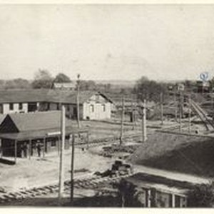 Original P&SR depot, the stone powerhouse that ran the trains, home on corner of Eleanor and Fannen Streets and the first Post Office of Sebastopol, 1905