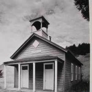 photo--black and white: Coleman Valley School in rural Sonoma County. The one room school was established in 1864. Two doors were for separate boys and girls entrances. Sign on building "Coleman Valley School District." " John G. Martin, lst State Superintendant of Public Schools was enabled to report in 1852 to the legislature certain information which he had gleened the previous year in the matter of public instruction. With respect to Sonoma County he stated that the number of children was 250, that there was one school at each of the following places, Sonoma, Santa Rosa, Analy, Bodega and Mark West-the three former being English and the rest Spanish which were entirely supported by contgributions & tution money." quoted from History of Sonoma County Munro-Fraser, J.P.
