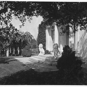 A view of the south entrance to the bowling alley (now the Tea Room), flanked on either side by a stone lion statue. A plant covered pergola and the rose garden are in the background.