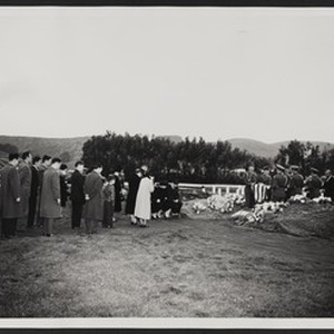 A photograph of the burial ceremony and attendees of Hiroshi Sugiyama's reburial ceremony, 1948 December 15, Golden Gate National Cemetary, 1300 Sneath Lane, San Bruno, California, USA. Photo by Kameo Kido Photography, 1496 Ellis Street, San Francisco, California, USA.