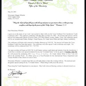 Joyce L. Rodgers (Church of God in Christ), Texas, letter, 2001 May 20, to Maggie Wheeler (Church of God in Christ), Dallas, Texas. [Description English/roman)]