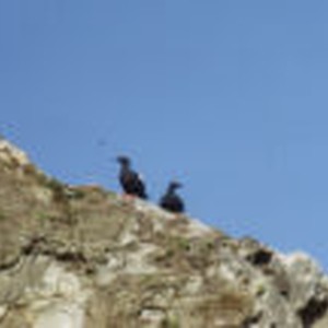 Two pigeon guillemots standing over a cliff.