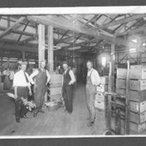 Photo--sepia: Inside a packinghouse circa 1915--possibly a flower of vegetable packinghouse. Four men posing for picture standing around shipping boxes.