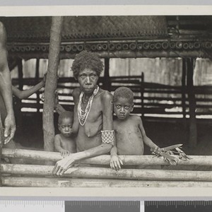 An Ni-Vanuatu woman and two children look out from a log structure. One child holds a knife and other tools. A man stands out of frame of photograph with one arm showing. Title transcribed from envelope. Date devised by cataloger. . Verso of photo reads: "New Hebrides Van, N. H. - but look at the man's fine arm."