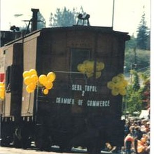 Photo--color, mounted: Apple Blossom Parade in Sebastopol with a box car decorated in yellow balloons. A sign on the rear of the box car states: "Sebastopol Chamber of Commerce."