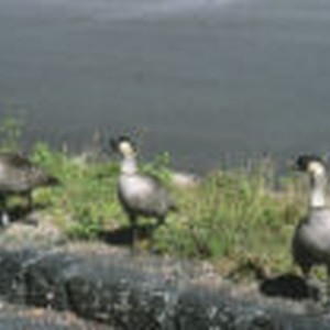 Three geese standing on a cement ledge at the Kilauea Overlook.