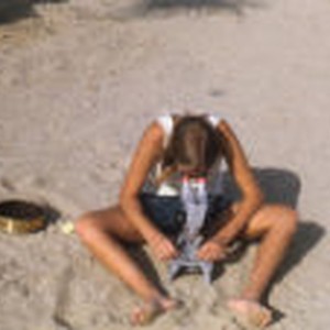 Student Kathy Rile sits and looks through microscope at the Salton Sea.