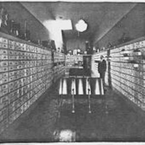Photo--black and white: Interior of the of Buster Brown Shoe Store on Main Street in Sebastopol, CA in 1920. Boxes of shoes line both sides of walls and two sets of theater style seats are in the center of the long store.