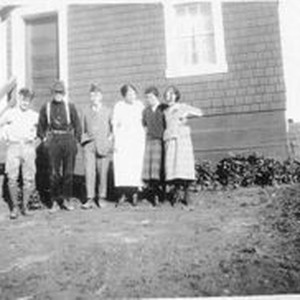 Photo--black and white: Six men and women stand in front of Karl Asman's house at Bodega Bay. The man in white is Karl Asman and the woman on the right is possibly his wife Alice Riddell Asman. Circa 1919.