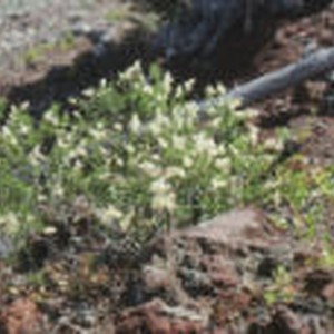 White blooming flowers with green leaves growing out of a red volcanic rocky slope on Wizard Island.