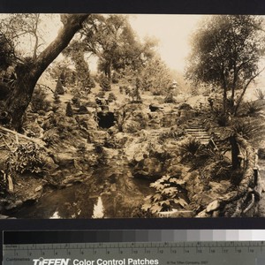 View of a rocky, wooded area of the garden canyon, with stone steps leading out of it. The label that accompanies this photo in the album reads "No. 106 Rockery in Japanese garden, about 1913." Image is very similar to photCL 107 vol7 (69).