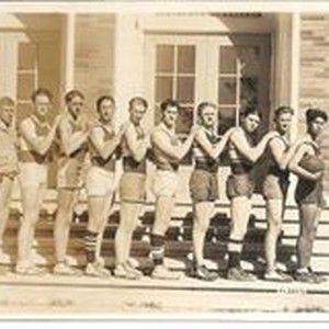 Photo--sepia: Analy Union High School yearbook (Azalea) photo in 1927 of the "A" class basketball team standing on the steps of the gym. Coach K. W. Shattuck is first man on left. Photograph by Hartsook.