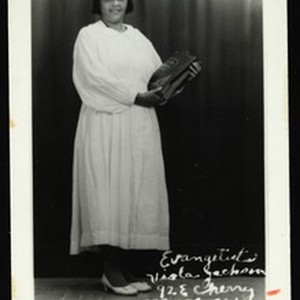 Photograph of Viola Jackson, Orange, Texas, [s.d.]. "Evangelist Viola Jackson, 92 E. Cherry, Orange, Tex." -- written on front. "Jan Zweig" -- written on back. [Description English/roman)]