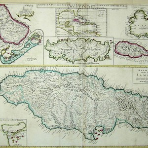One sheet with maps of six islands. Kashnor dates as ca. 1719. Submaps: Generall Chart of the West Indies; Barbados with St. Michaels or the Bridge Town; Bermudos; Tobago; Antego; St. Christophers; New Map of the Island of Jamaica; The Harour of Port Royall.. Relief: pictorial. Graphic Scale: Miles (each map). Projection: Plane. Watermark: Fleur-de-lis BA. Printing Process: Copper engraving. Other Features: Submaps.