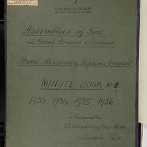 Pentecostal Missionary Union [PMU]/Assemblies of God [AoG] Home Reference Missionary Council [HRMC] minute Book No. 9 including Home Reference Missionary Council annual statement, 69 pages of index followed by 209 pages of minutes. All matters relating to Assemblies of God [AoG] Home Reference Missionary Council council member appointments, decisions, policy and missionary personnel issues [Description English/roman)]