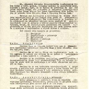 Declaration of the seventh Conference of preachers of Church of God held in Dalfsen, Netherlands on August 22 – 27, 1983. Contains statements of worship, confession, declaration, commitment and mission of the Church of God in Europe. [Description English/roman)] Deklaracija sedme konferencije propovjednika Crkve Božje koja se održala u Dalfsenu u Nizozemskoj 22. - 27. kolovoza 1983. godine Sadrži izjave o hvaljenju, ispovijedanju, deklaraciju, obvezu – obećanje i izjavu o ispunjenju. [Description (original non-English/roman language/script)]