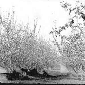 Negative glass-plate photo: From a glass plate negative made by William Borba. Apple orchard in bloom in Sebastopol. Rows of apple trees in full bloom. Damage to negative across the bottom.
