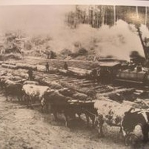 Photo--black and white: The woods in the background with a train loaded with logs and a skid road and oxen pulling logs. Mendocino County.
