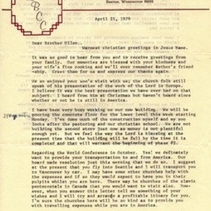A letter by Robert C. Stott to Ludvik Üllen about the work being done in his church and about the cost of flights and travel about Ludvik Üllenu's travel to the conference. [Description English/roman)] Pismo Roberta C. Stotta Ludviku Üllenu o radovima u njegovoj crkvi i o troškovima putovanja Ludvika Üllena na konferenciju. [Description (original non-English/roman language/script)]