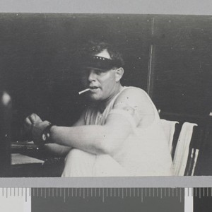 Jack London dressed in all white and visor sits and smokes a cigarette.